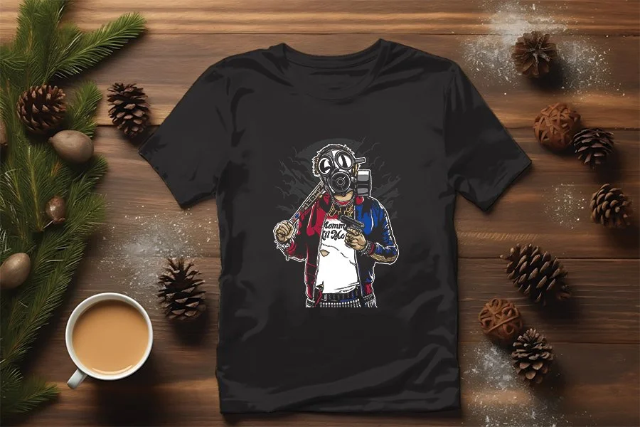 Dynamic Design: The front of the t-shirt features a striking graphic, showcasing a fierce figure wearing a gas mask. This eye-catching design combines elements of street style and comic book art, making it a unique addition to any wardrobe.